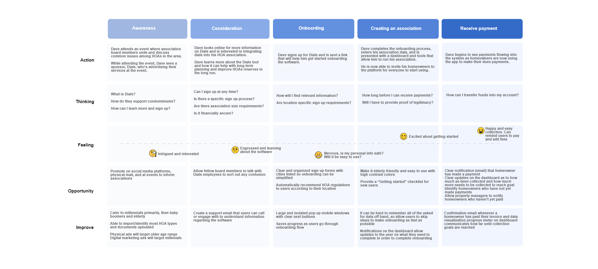 When I returned home from my trip, I analyzed key insights from user interviews, identifying common pain points, goals, and behaviors related to the study. I then created a user journey map that outlined the entire process—from initial awareness to the moment an HOA manager sees money flowing through the system—capturing the experience from start to finish.